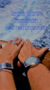 Ik leg mijn hand op de hand van mijn man we kijken elkaar aan en genieten van de zon op onze huid. De wind speelt met mijn haar en we lachen naar elkaar,